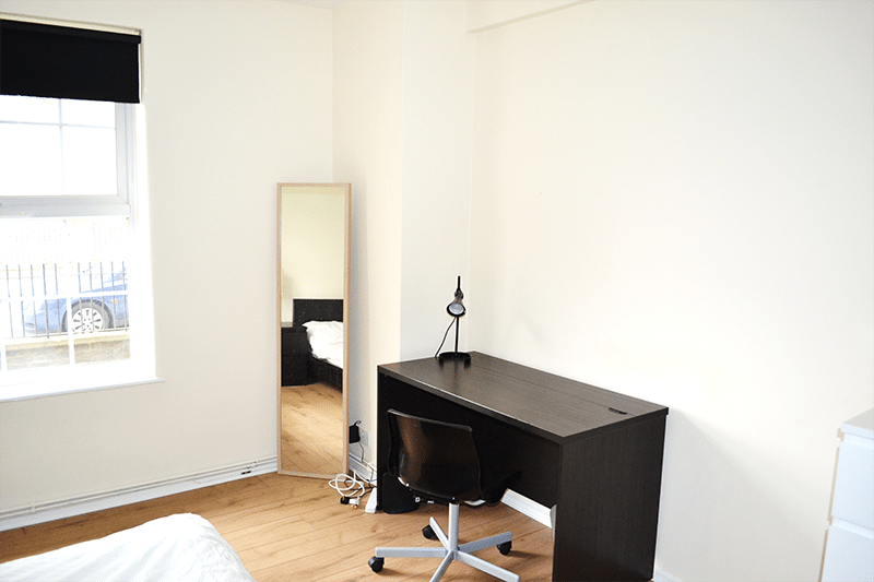 This spacious and bright 17 square metre double room comes fully furnished including a big double bed, chest of drawers, clothes rail, desk & swivel chair, bedside table and lamp. Basic appliances and utensils included in the kitchen with pots and pans, cutlery and crockery to use.